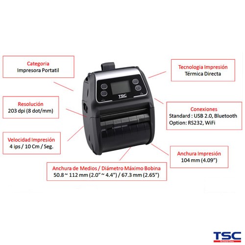| 99-052A002-50LF | Alpha-4L/LCD/WIFI/BT, 4″Impresora Portatil de 203 dpi, Velocidad 4 Pps, Pantalla LCD, con Conexiones Wi-Fi y Bluetooth, Memoria Flash de 16MB y 32MB SDRAM, Lenguajes de Programación y Emulación TSPL-EZ or CPCL |